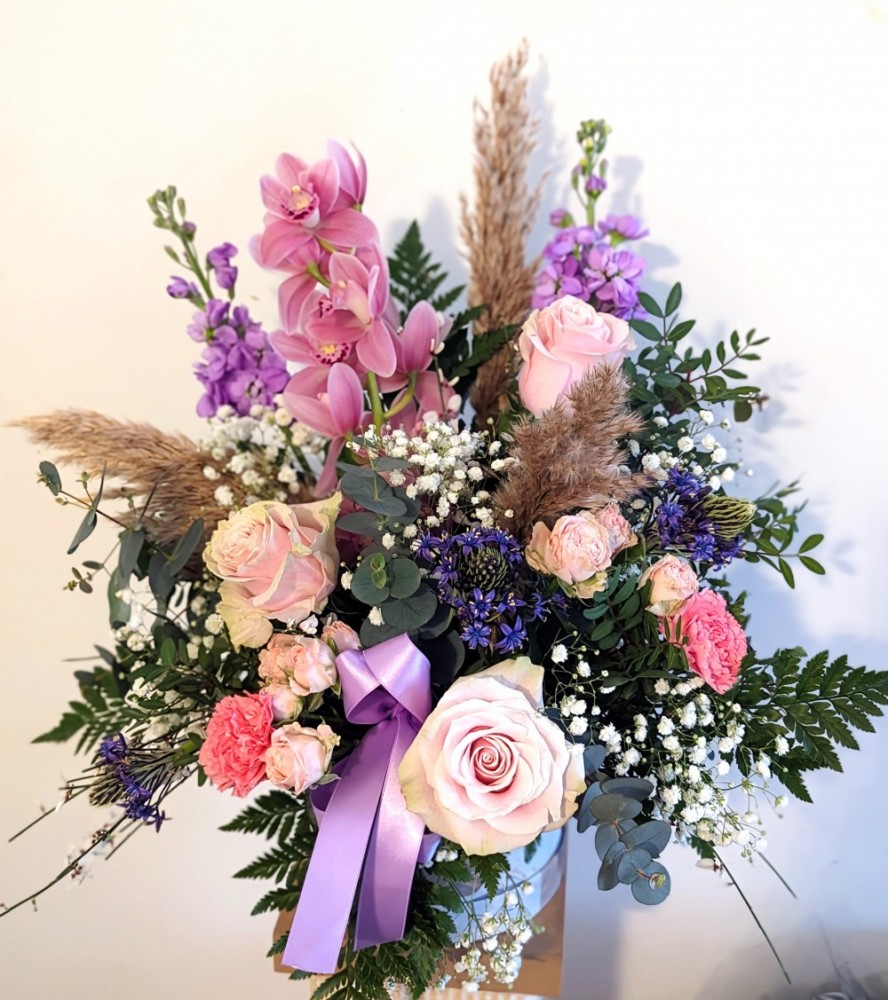 Indulge in elegance with our exquisite Luxury Hatbox Arrangement, designed to impress. Presented in a stylish hatbox, this stunning arrangement features a carefully curated selection of premium blooms, including delicate orchids, sumptuous roses, and other luxurious flowers in soft shades of pink and lilac. Perfect for a special gift, celebration, or simply to add a touch of beauty to any space, this timeless design is both sophisticated and effortlessly chic.